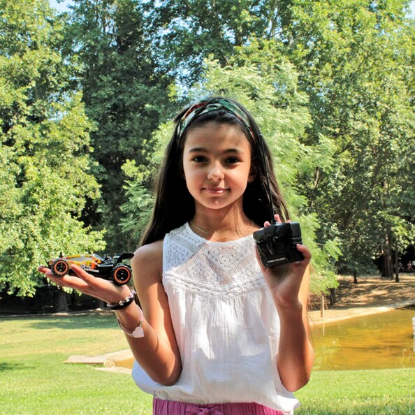 Die einfach zu bedienende Funksteuerung arbeitet mit einer Frequenz von 27 MHz und hat eine Reichweite von 20 Metern. Das schnelle und reaktionsschnelle Auto kann drinnen und draußen mit bis zu 8 km/h fahren.